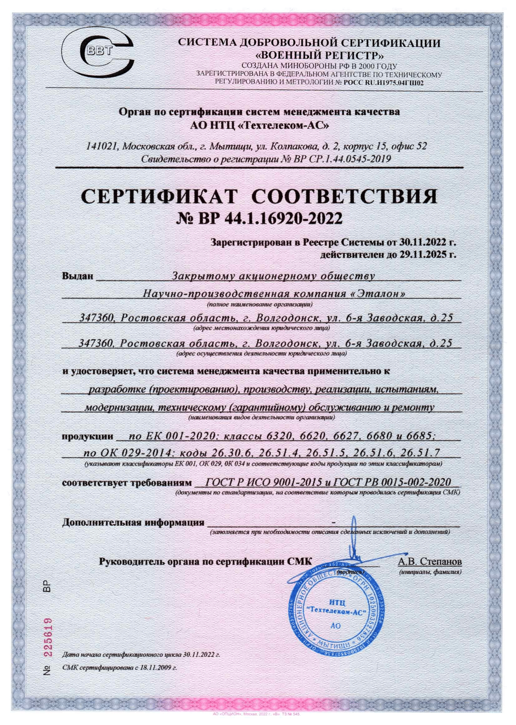 Сертификат соответствия № ВР 44.1.16920-2022